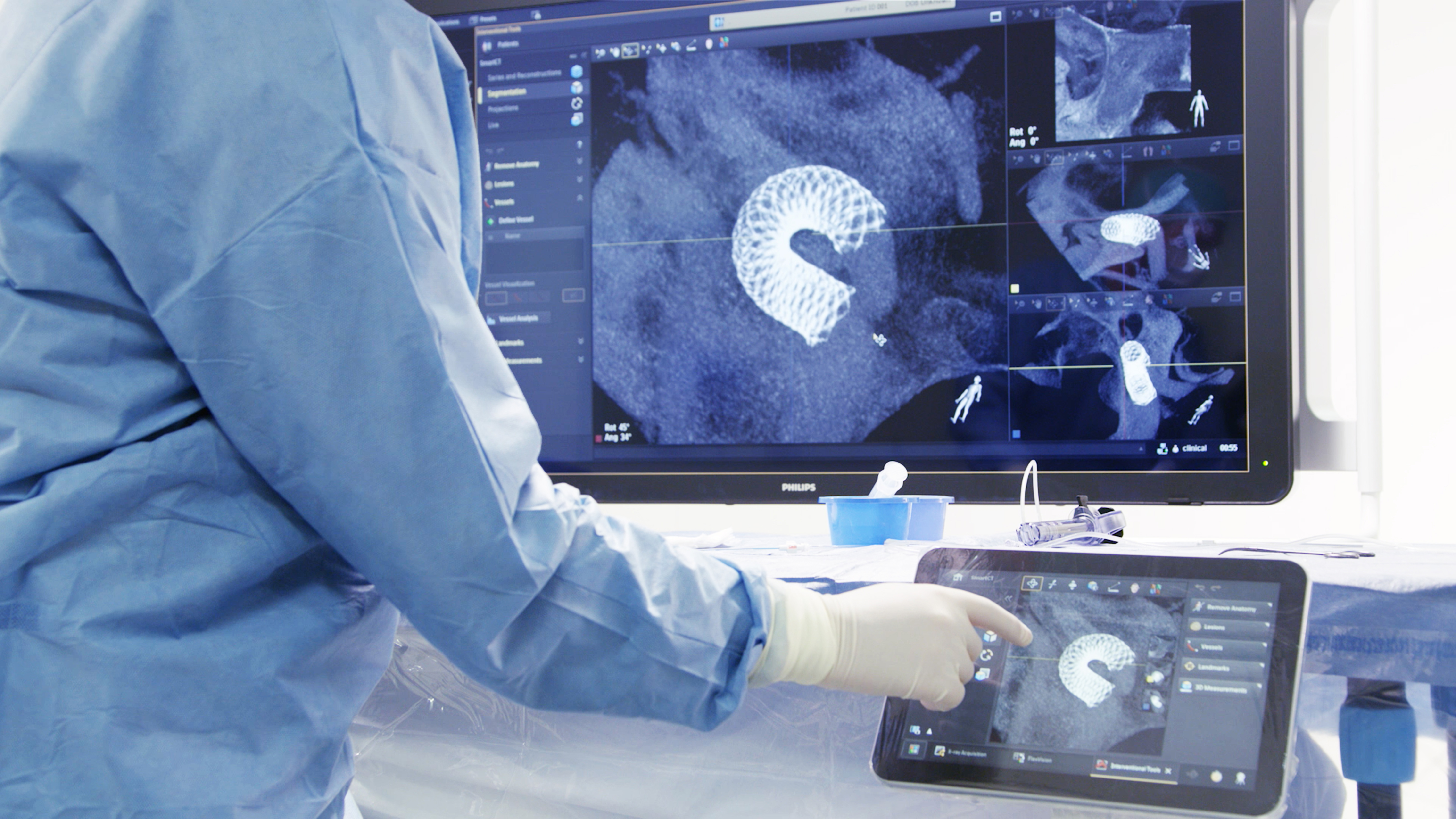 Philips’ latest Azurion image-guided therapy platform integrates essential lab systems and tools needed for complex interventional procedures into an uncluttered laboratory environment in which interventionalists can focus on treating the patient rather than being distracted by the technology. SmartCT brings total control of the Azurion platform to a touchscreen tablet situated alongside the interventional radiology table. This eliminates the need for clinicians to leave the sterile field and step into an adjacent control room, as well as supporting faster and better-informed decision making.