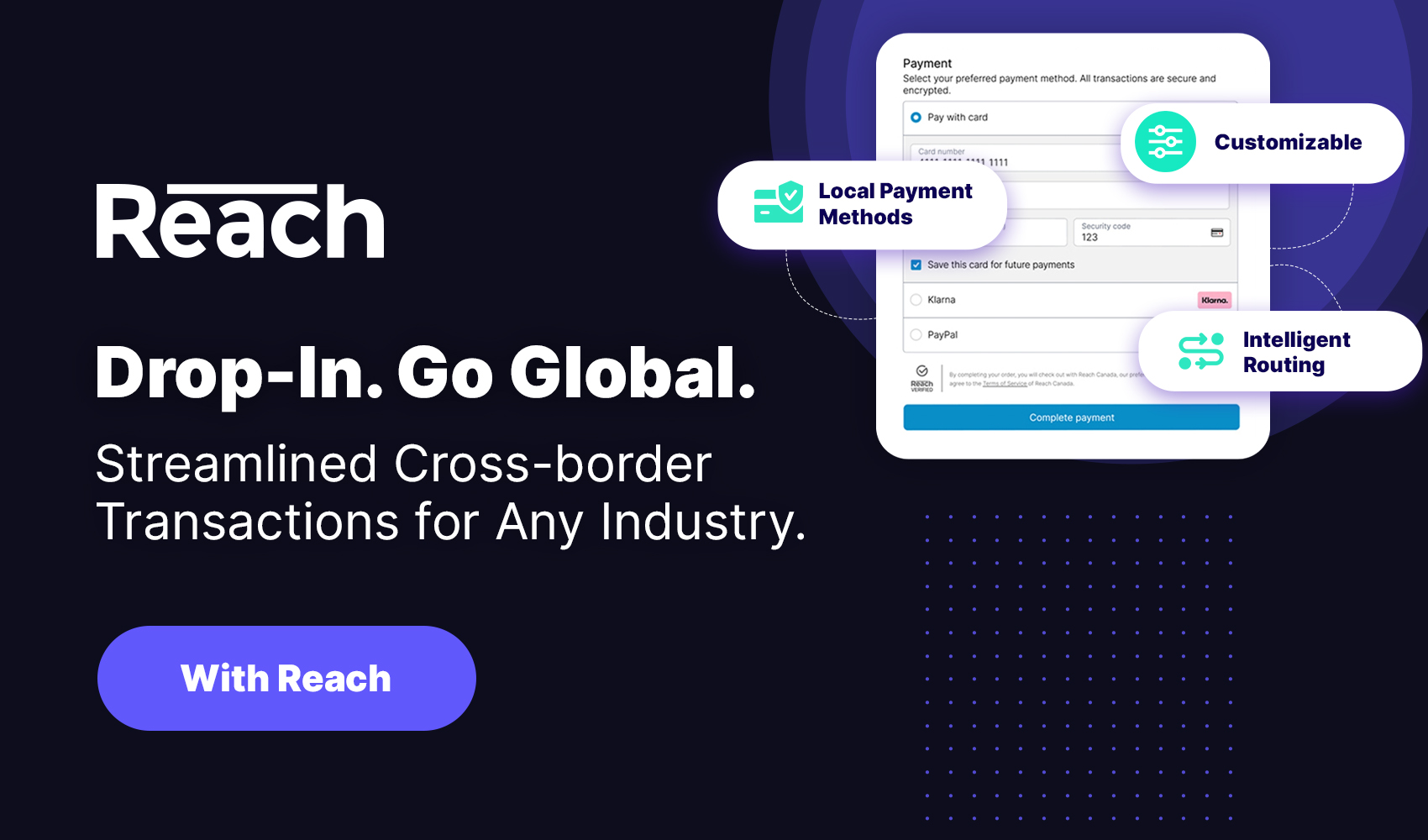 Integration with an existing online storefront is quick and easy, as only a few lines of code are required. Deployable in 19 different programming languages, Reach Drop-In provides a customizable, branded checkout that is the most robust cross-border payments system on the market.