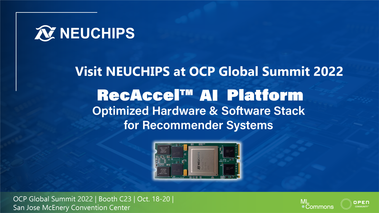 Leading cloud service providers have shared that the overwhelming majority (80%+) of the AI inference cycles in the data center are actually for recommendation models, not vision or language. NEUCHIPS' first product, RecAccel™ N3000, was designed specifically for DLRM and will be ready to sample later this year with easy-to-use software and leading-edge performance. NEUCHIPS will be presenting and participating in OCP Global Summit Oct. 18-20 in San Jose.