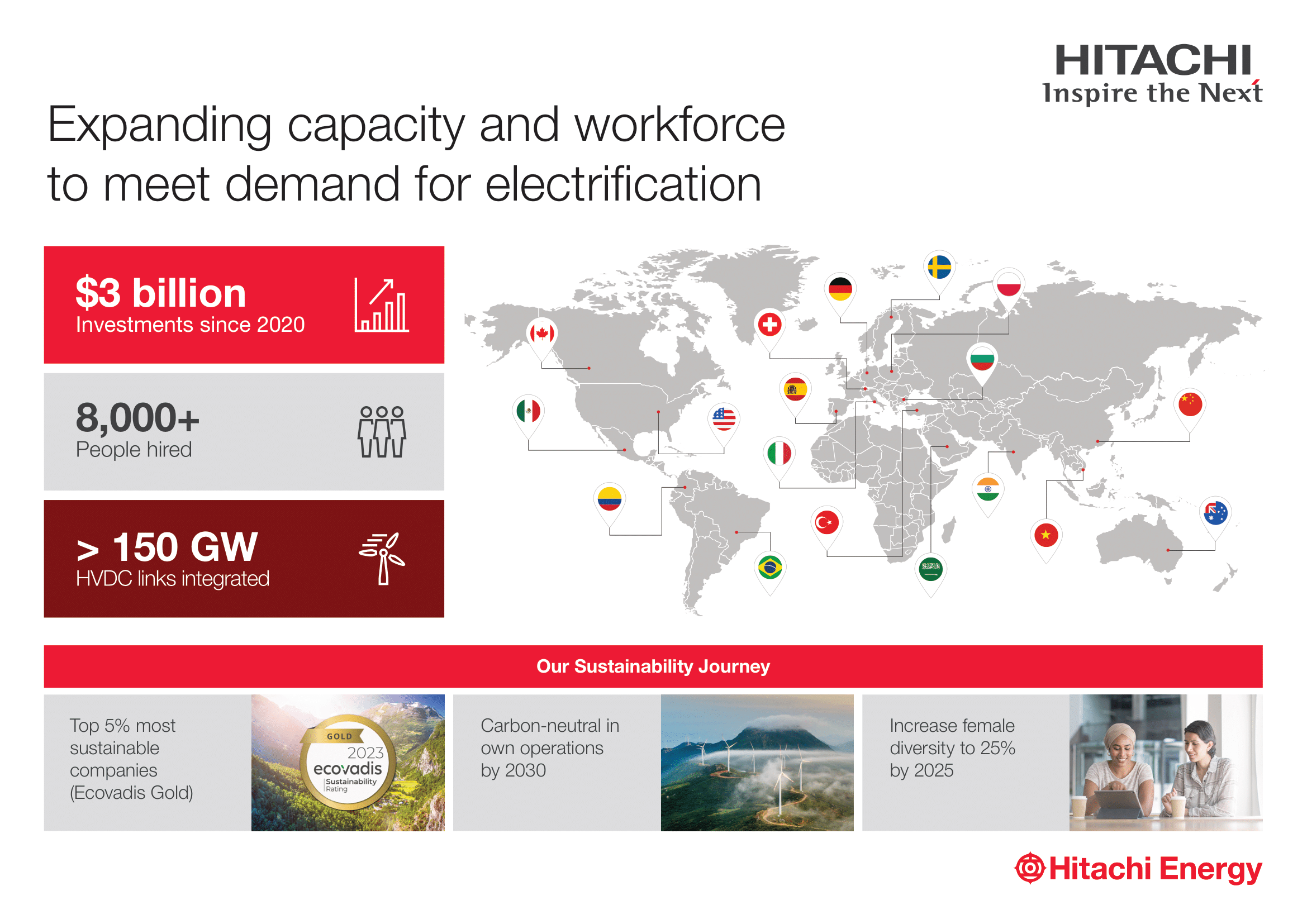 The company has consistently expanded its capacity to meet accelerating demand driven by the clean energy transition. Since 2020, when Hitachi began its strategic investment, Hitachi Energy has increased its workforce by more than 8,000. Within the same period, the company also invested $3 billion in manufacturing and engineering footprint, and Research & Development (R&D), expanding collaboration and driving the company to become the strategic partner throughout the customers' entire lifecycle.